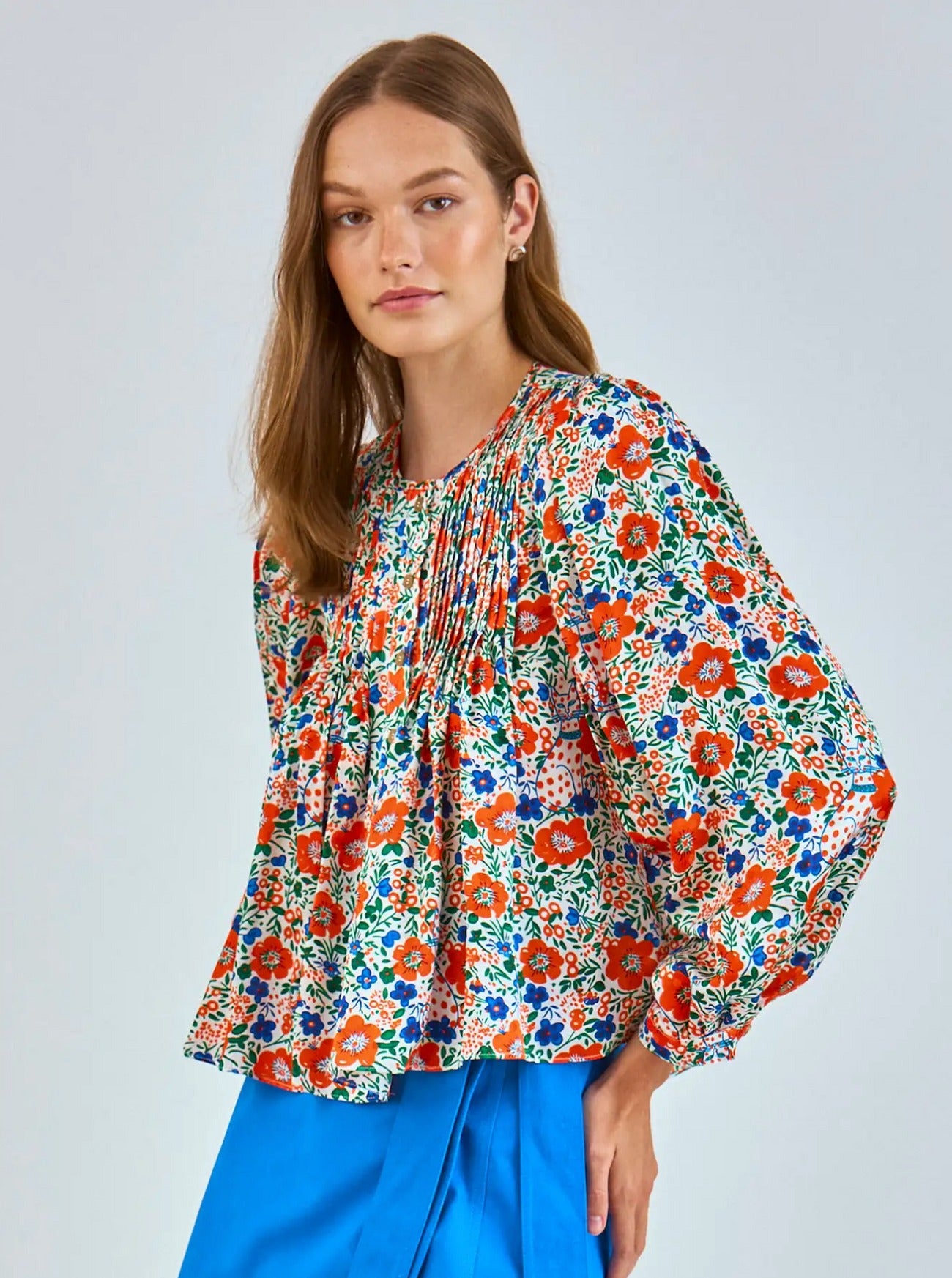 The Daphne Top is a button-front blouse with pintuck details, a crew neck line, and long full sleeves with button cuffs. Made from a luxurious silk blend, it's the perfect blend of style and comfort.
