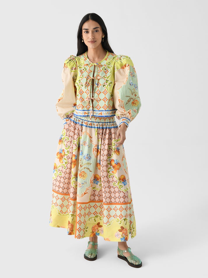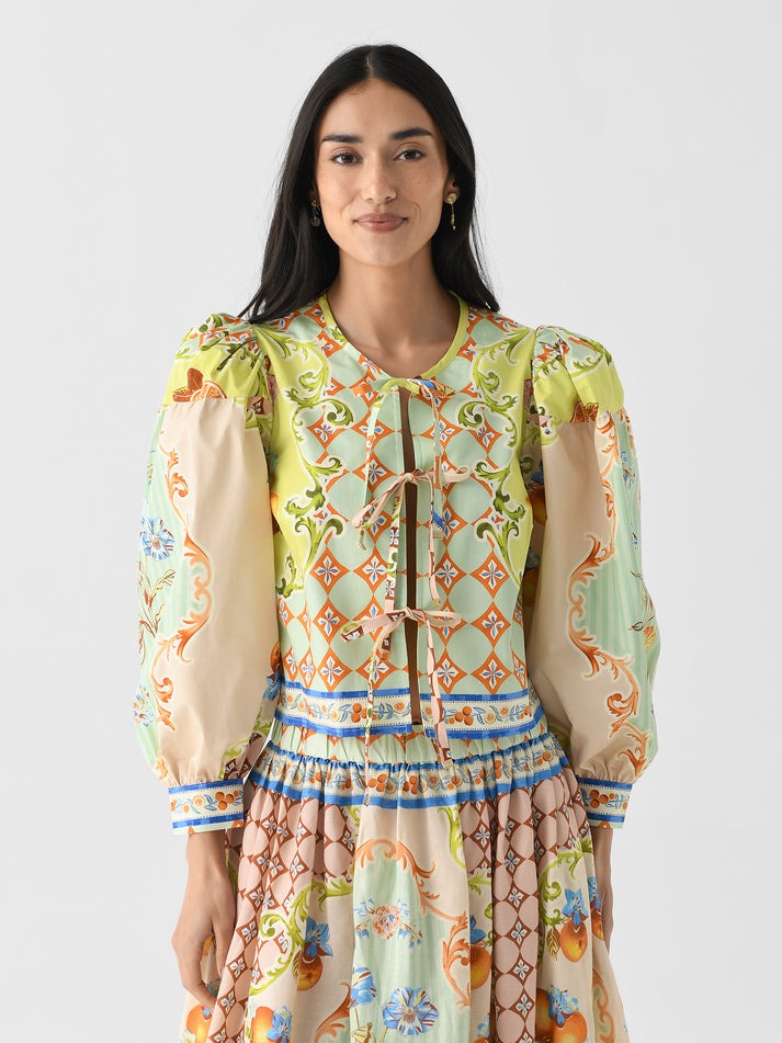 This cropped, boxy top features a playful tie closure, balloon sleeves with contrast cuffs, and a vibrant Gasparilla Gardens print.