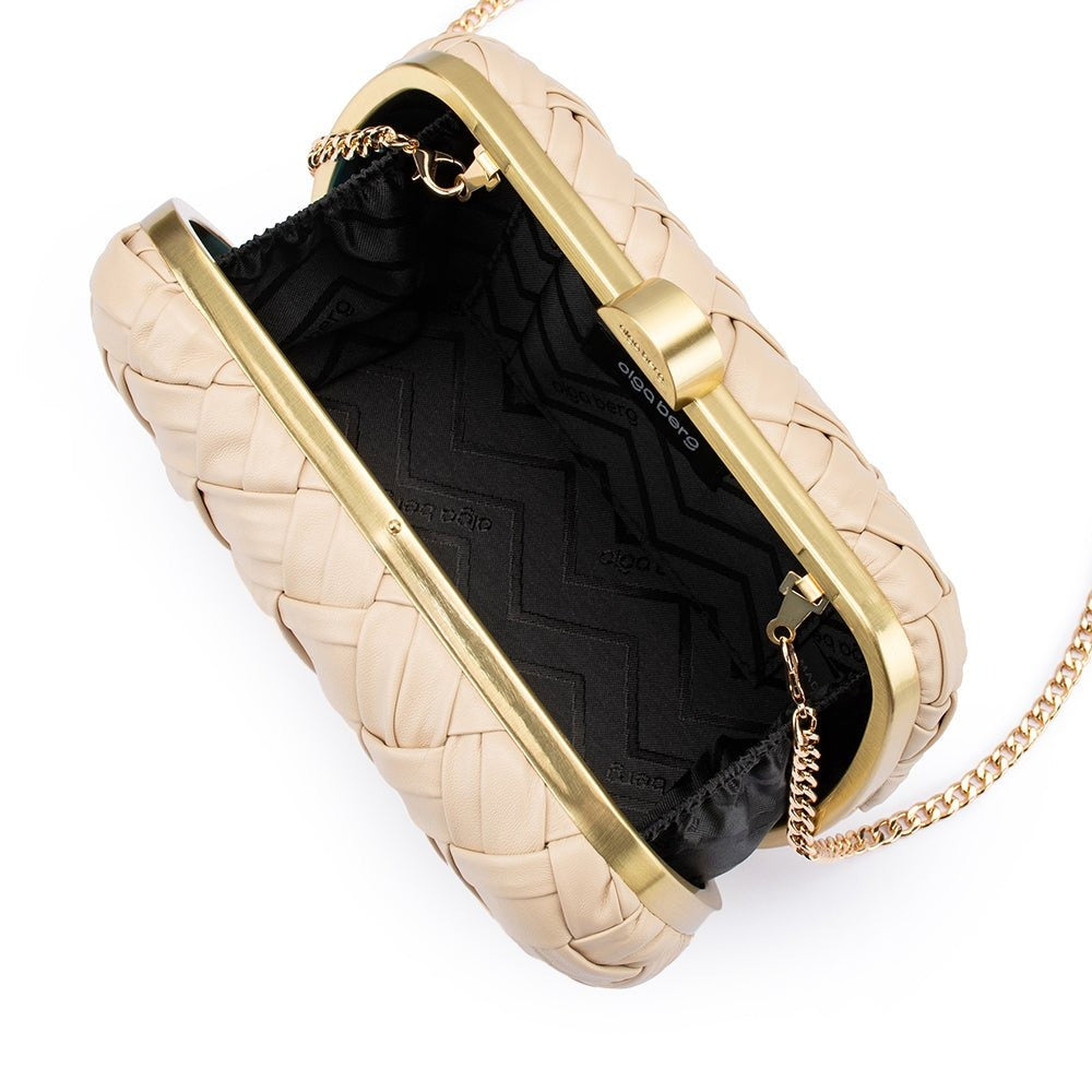 The HAVEN Woven clutch is a stunning, textural piece featuring strips of vegan leather artfully woven over the surface of this sophisticated hardcase clutch. A classy block lock closure will keep your belongings secure inside, and the detachable shoulder chain will allow you to switch to hands free at a moment's notice.