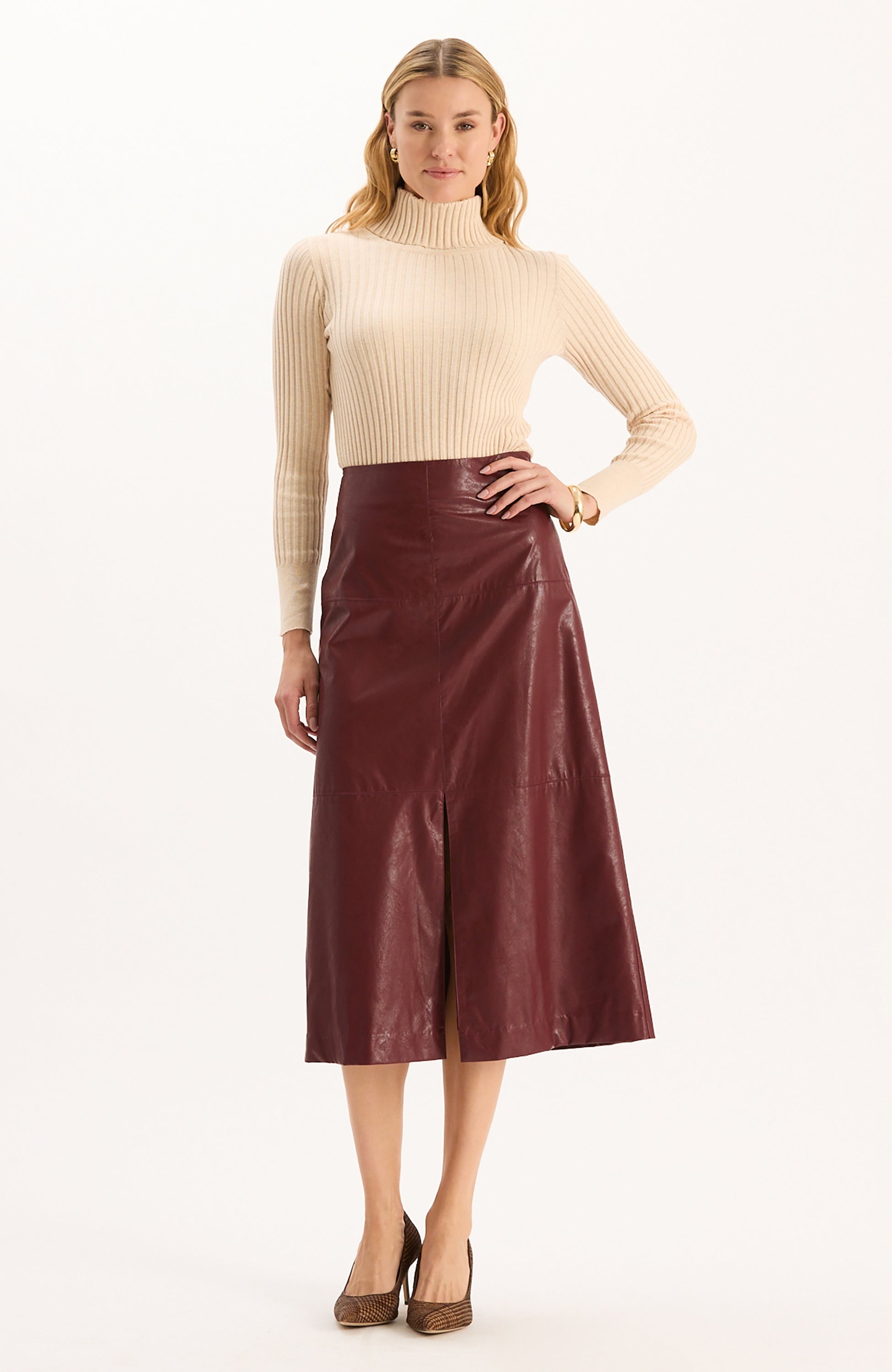 The Pheobe Vegan Leather Skirt has a luxurious feel with modern edge. This midi features a sleek, A-line silhouette with front slit detail that adds movement. Perfect with slim turtlenecks, silk blouses, or tailored jackets, it’s a versatile style that transitions seamlessly from day to night.