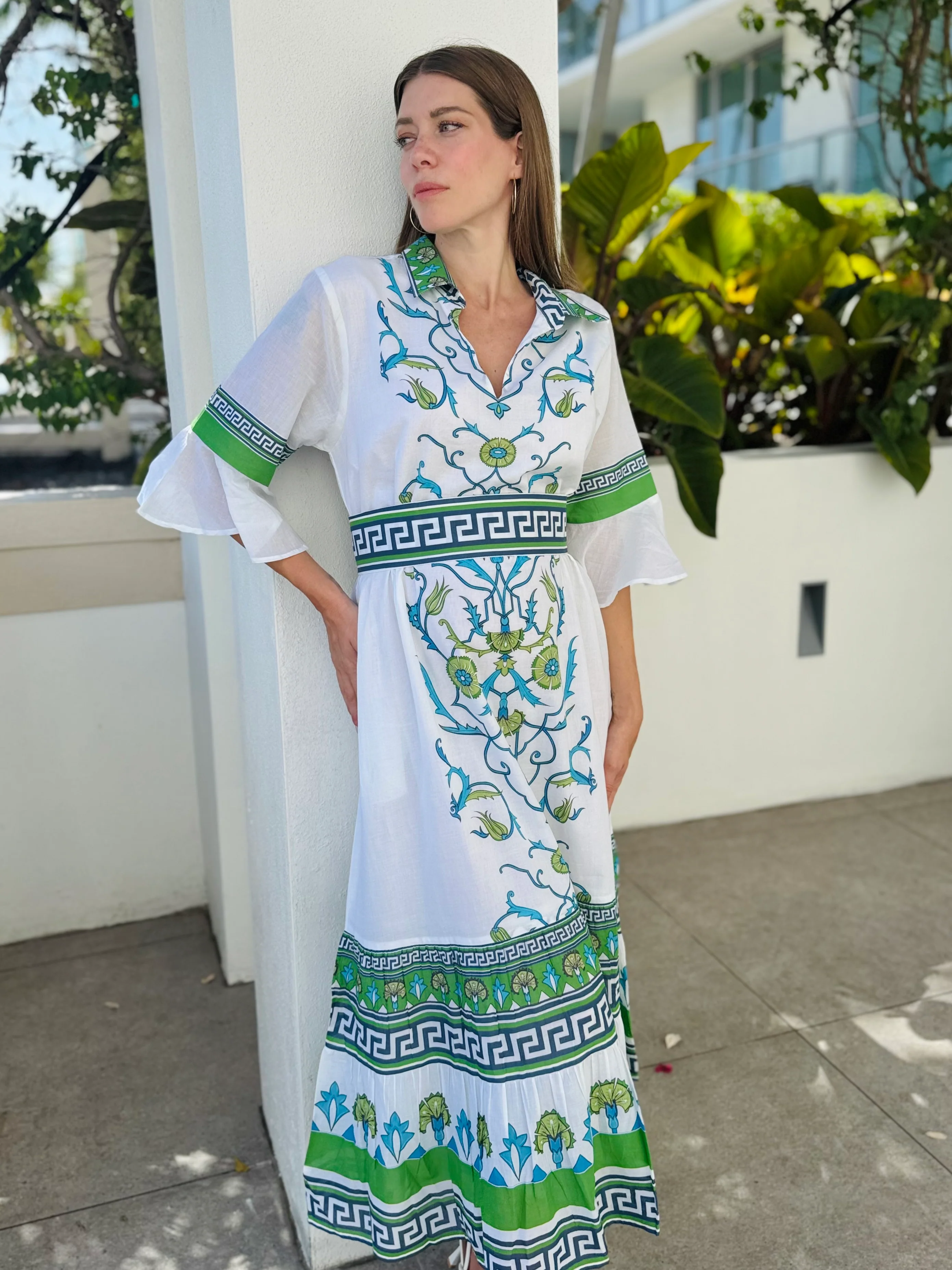 The Ascot Maxi is a flattering shift silhouette with a collar. We love the elegant bell sleeves, and the sash that gives definition to this classic body. There are two pockets on the side seams.