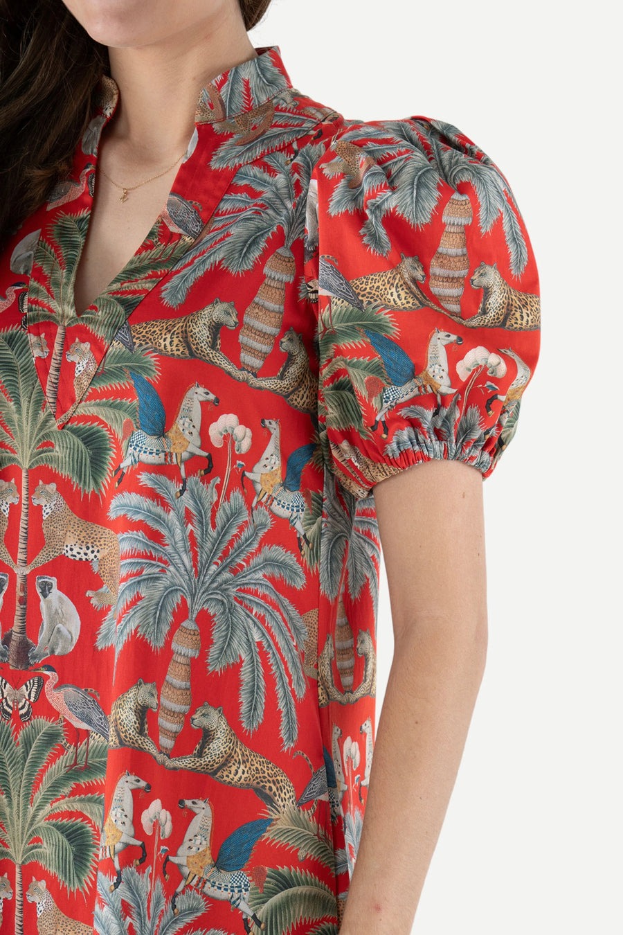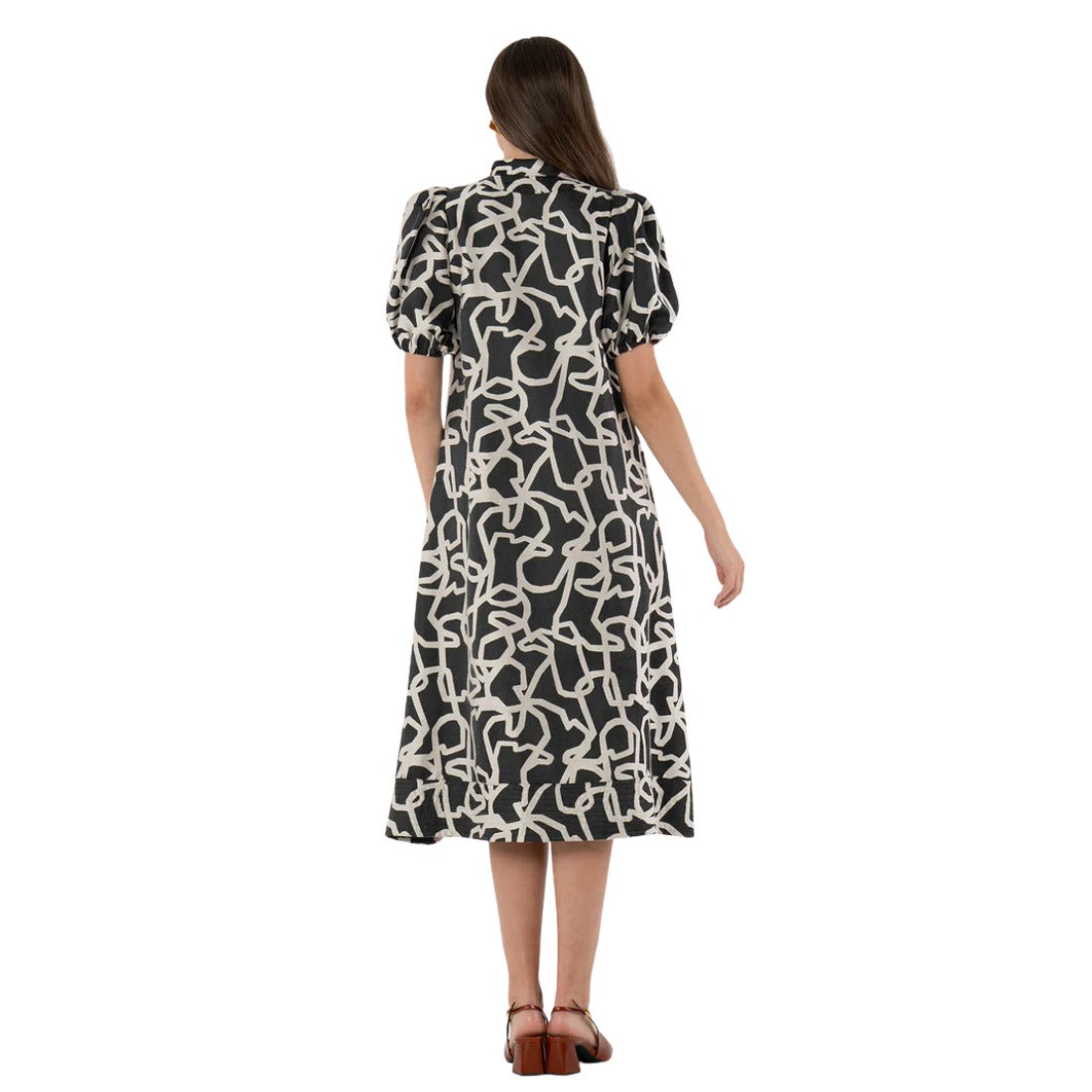 The Hampton Dress in Boot Print showcases an abstract pattern created from interlocking boot outlines, a nod to western heritage reimagined with modern flair. The black and ivory woven fabric adds soft texture and visual dimension, giving the design depth and character. This midi-length silhouette features a mandarin collar, V-neckline, puff sleeves, and a trapunto-stitched hem, finished with functional side seam pockets for effortless wear.