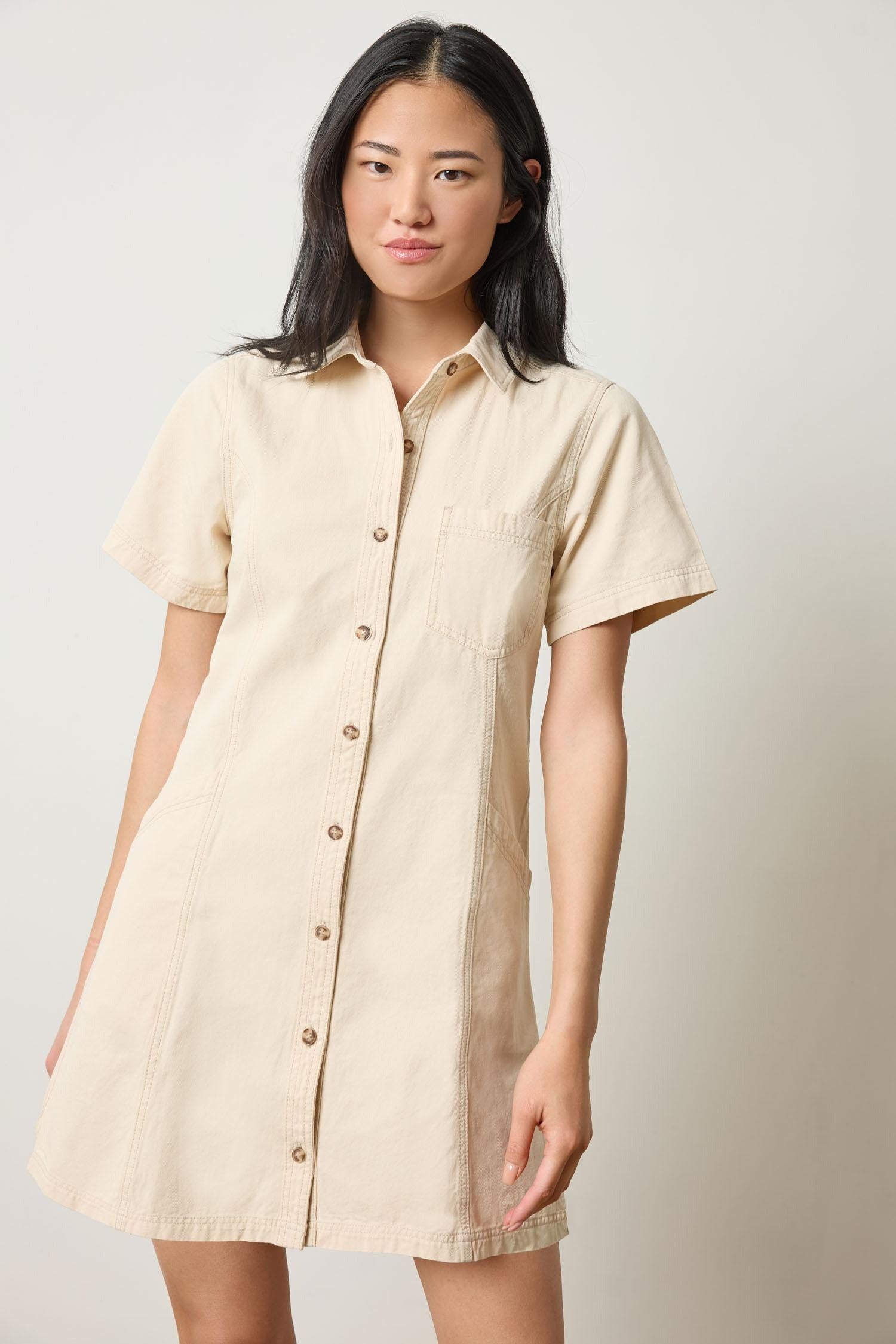 The Twill Paneled Shirt Dress is an effortless, wear-anywhere piece that transitions seamlessly through the seasons. Our garment-washed cotton twill is soft and the perefct medium-weight for fall as well as spring. A classic collar, button front, and short sleeves give it a timeless feel, while subtle seaming details create a flattering shape. Clean slanted front pockets add ease, making this a go-to dress for everyday wear. Pair it with anything from sneakers to boots for a look that's both polished and relaxed