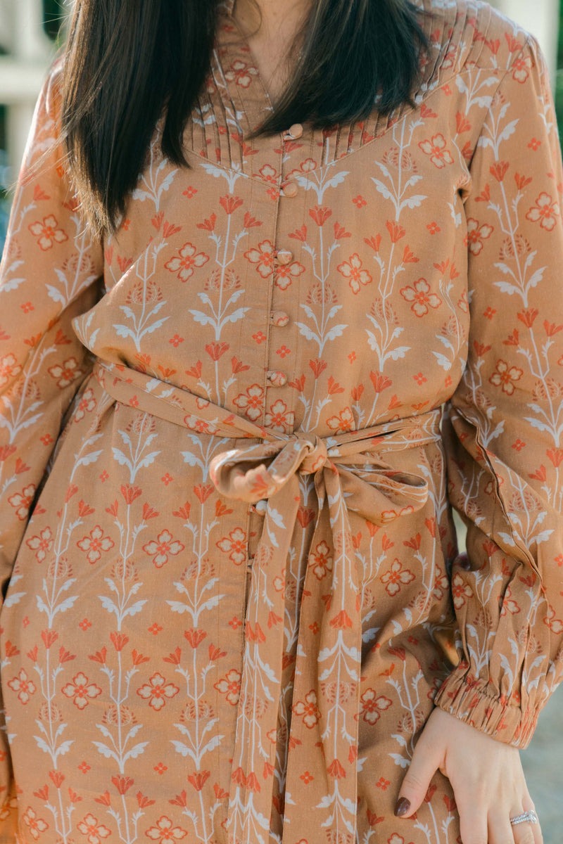 The Josie features a split neckline, button front placket, long blouson sleeves, and a matching tie belt.