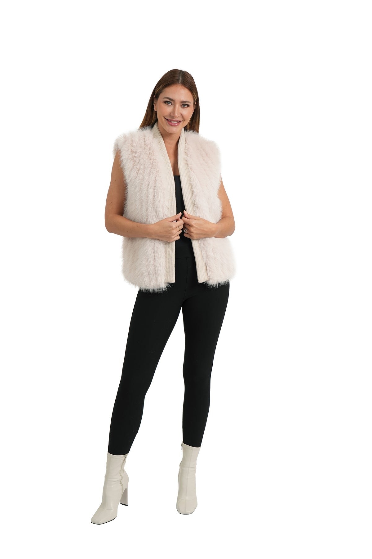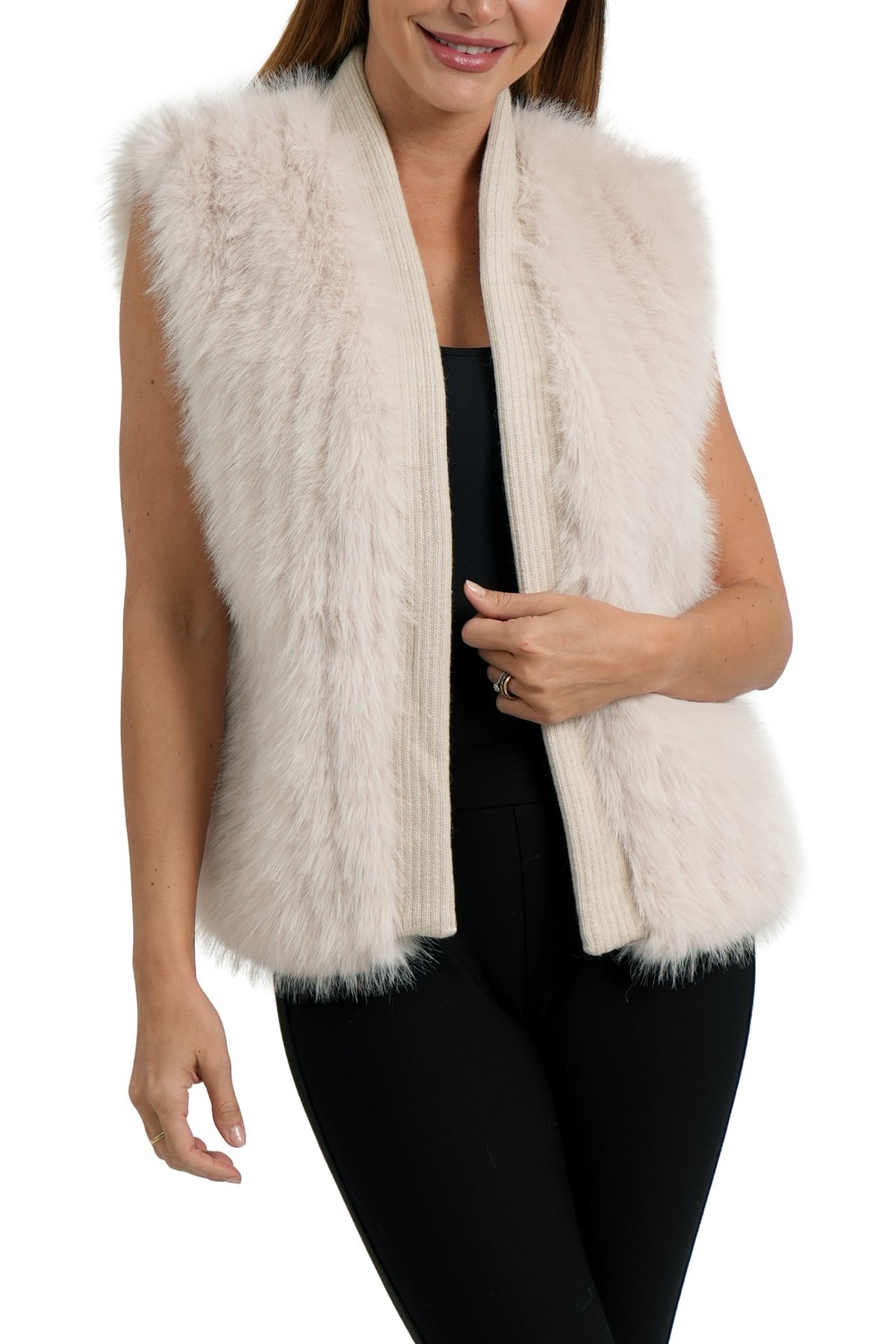 Kathy knit trim faux fur vest, stripe pattern, open front, knit placket, slit pockets, relaxed fit.